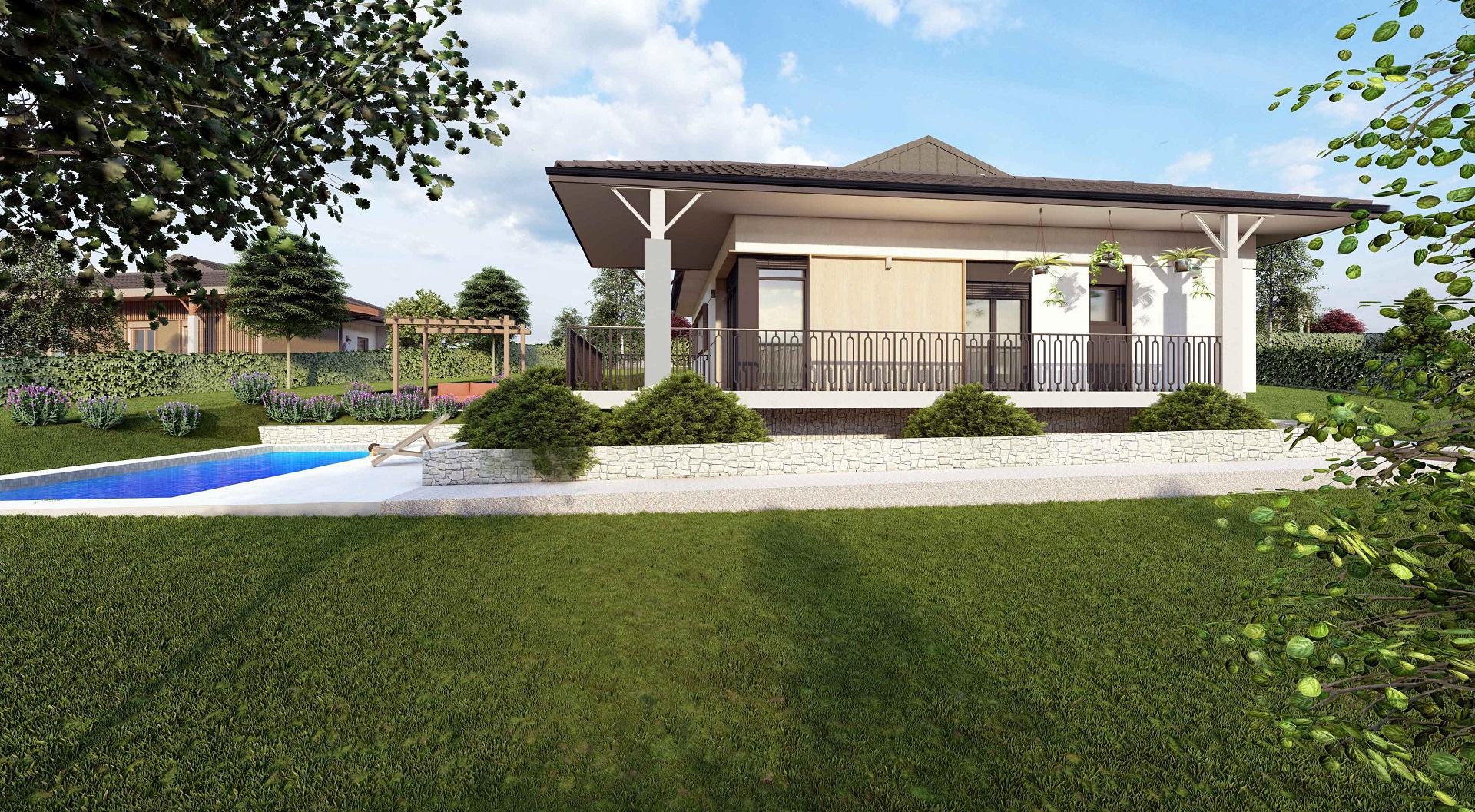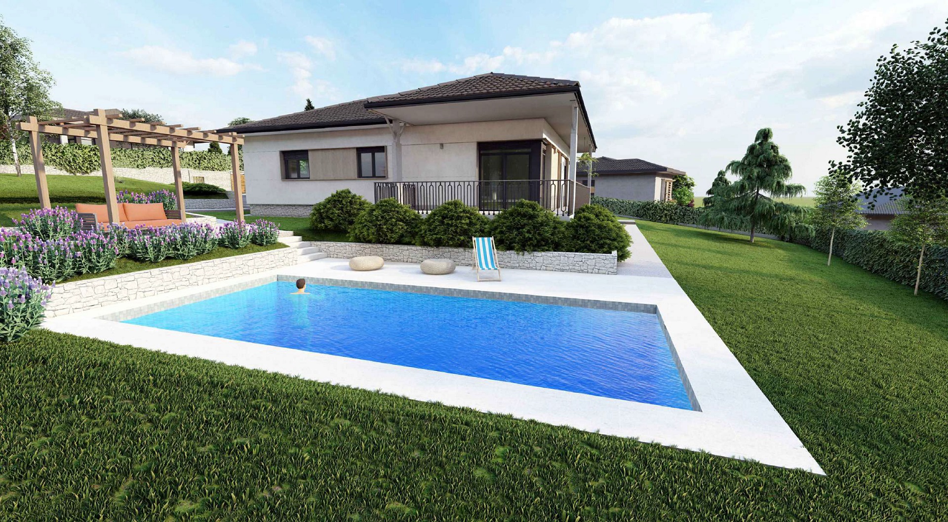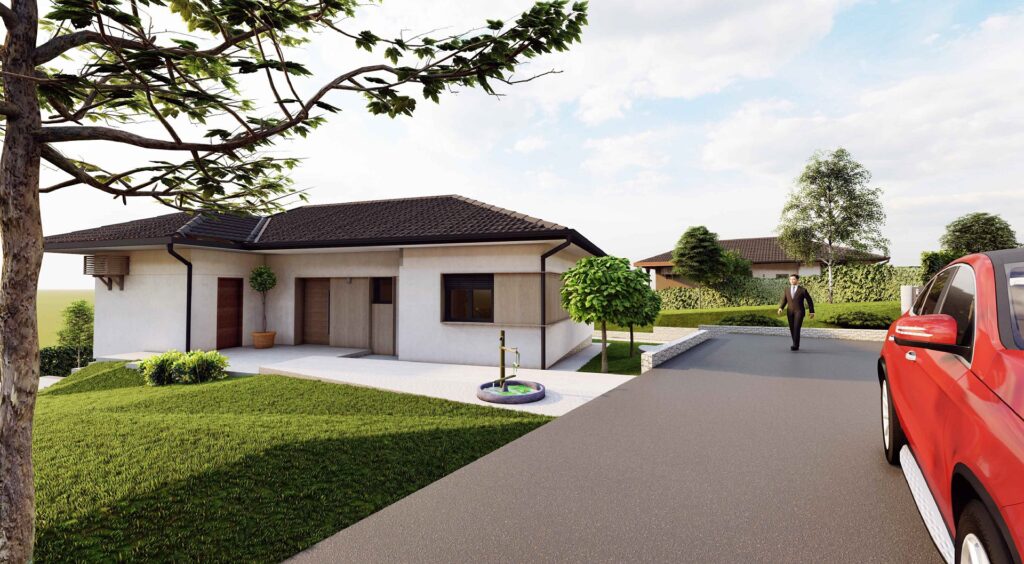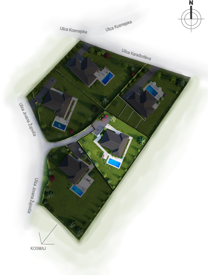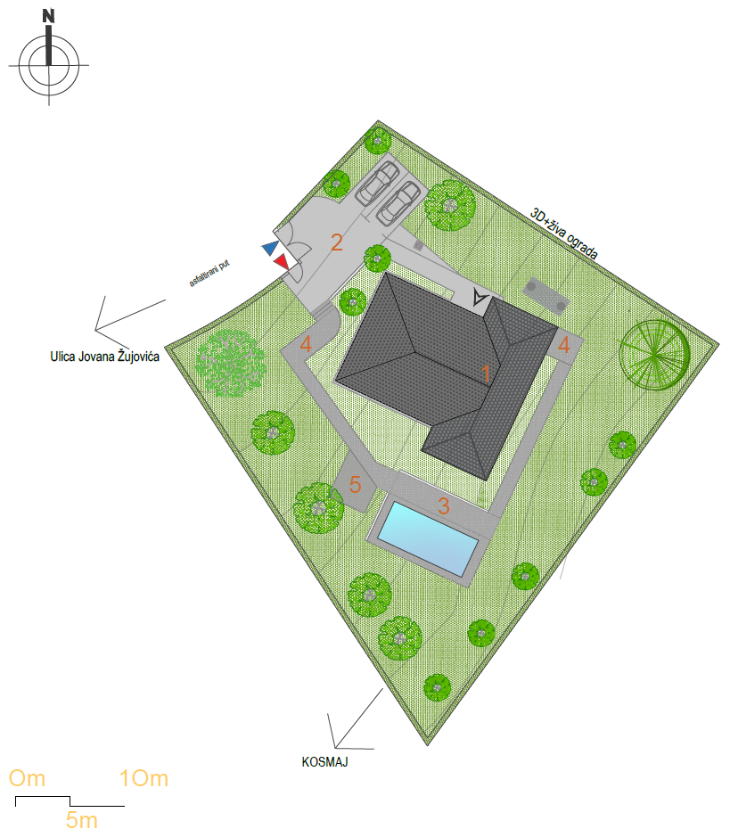TIP A Kuća 2 SITUACIJA m² 1 Kuća 178.05 2 Parking i ulazni deo 81.94 3 Bazen i sun deck 63.28 4 Staze 71.05 5 Plato 12.00 Površina placa: 1236 m² Pešački pristup Kolski pristup Septička jama Česma NoPROSTORIJAm²PODNA OBLOGA1ulaz2.80granit.ker.2garderober2.27granit.ker.3dnevna soba i trpezarija31.50granit.ker.4kuhinja6.60granit.ker.5hodnik5.80granit.ker.6soba 110.60granit.ker.7soba 210.60granit.ker.8kupatilo 16.70granit.ker.9soba 312.30granit.ker.10kupatilo 25.00granit.ker.11garderober4.00granit.ker.12ostava4.70fero beton13trem32.87granit.ker.14ulazni deo18.51granit.ker. UKUPNO neto: 154.25 m² UKUPNO bruto: 178.05 m² 3D PRIKAZ ENTERIJERA Građevinska dozvola Energetski efikasan objekat C razred Bazen 7×3,5m Podno grejanje Stolarija višekomorna PVC Sigurnosna ulazna vrata Keramika vrhunske klase 2 parking mesta Interfon i video nadzor Tavanski prosotor Tehnička prostorija Crni continental mat crep Visina plafona 2,90m Uređena dvorišta Čvrsta gradnja, armirano – betonska konstrukcija Spoljni zidovi – termo blok OPCIONO: Nadstrešnica za automobile Grejanje bazena Zalivni sistemi Alarmni sistem
